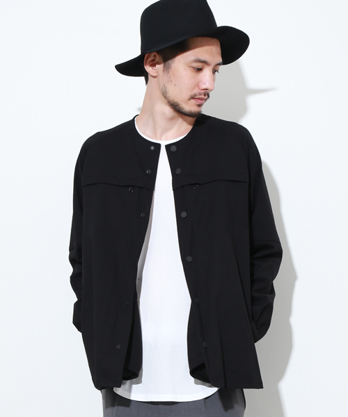 こちらはホワイトマウンテニアリングの新作。すっきり都会的に着こなせるノーカラーシャツは、私も欲しいくらい(笑)。モノトーンカラーですっきりまとめているのも今季的ですね!