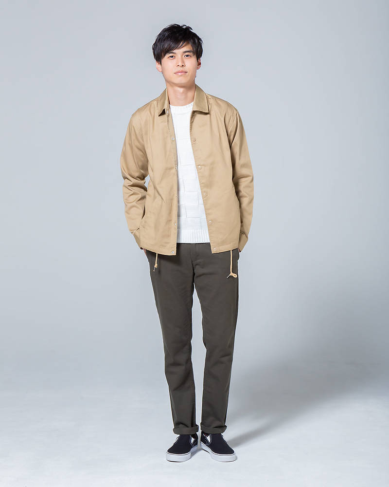明るいベージュ色のコーチジャケットが秋の季節感を感じさせてくれます。