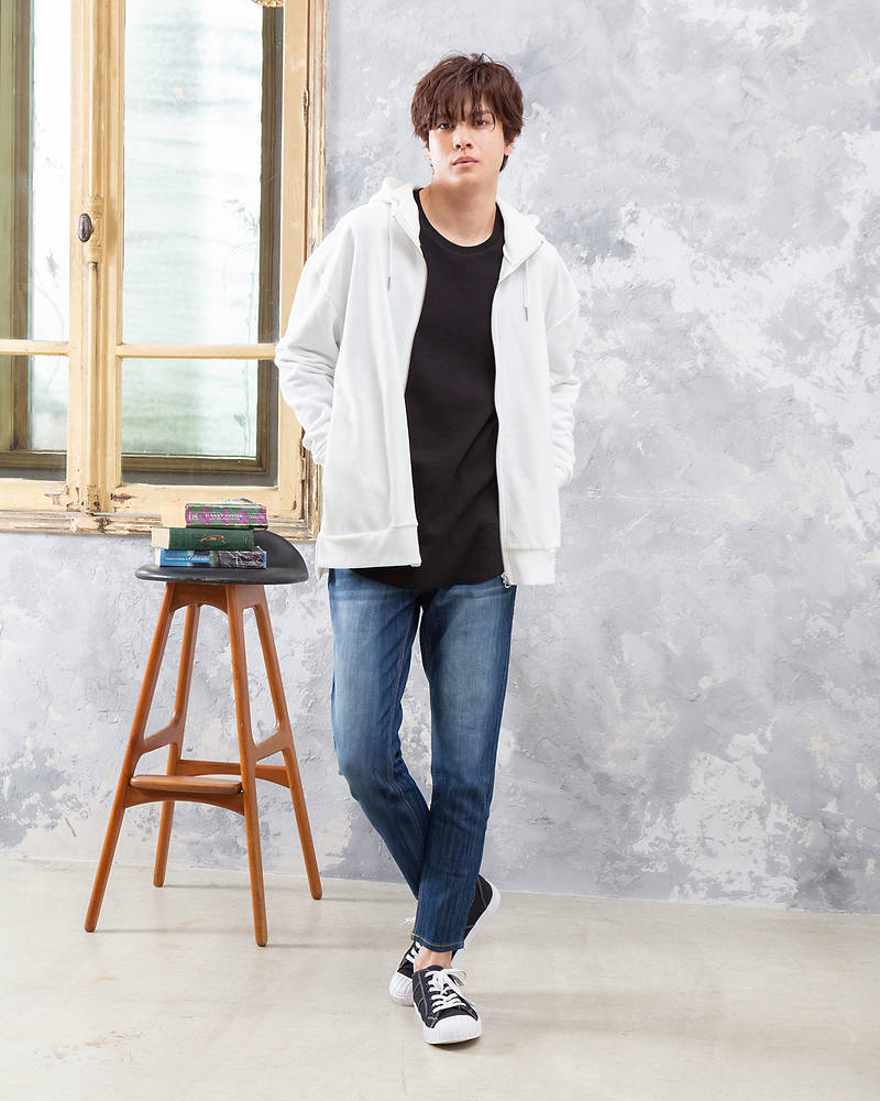上半身の色を黒でかぶせて、その分白パンで明るさの帳尻をあわせているコーデです。