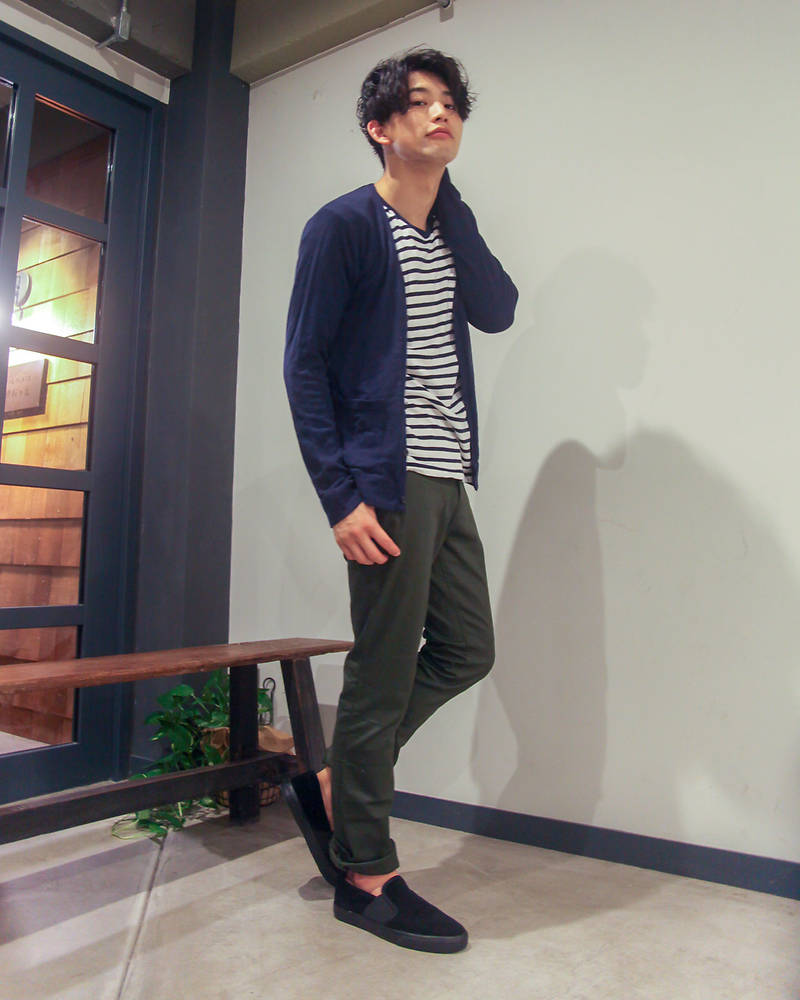 春秋どちらも超活躍する王道アイテム、ネイビーカーディガンを使ったコーデです。
