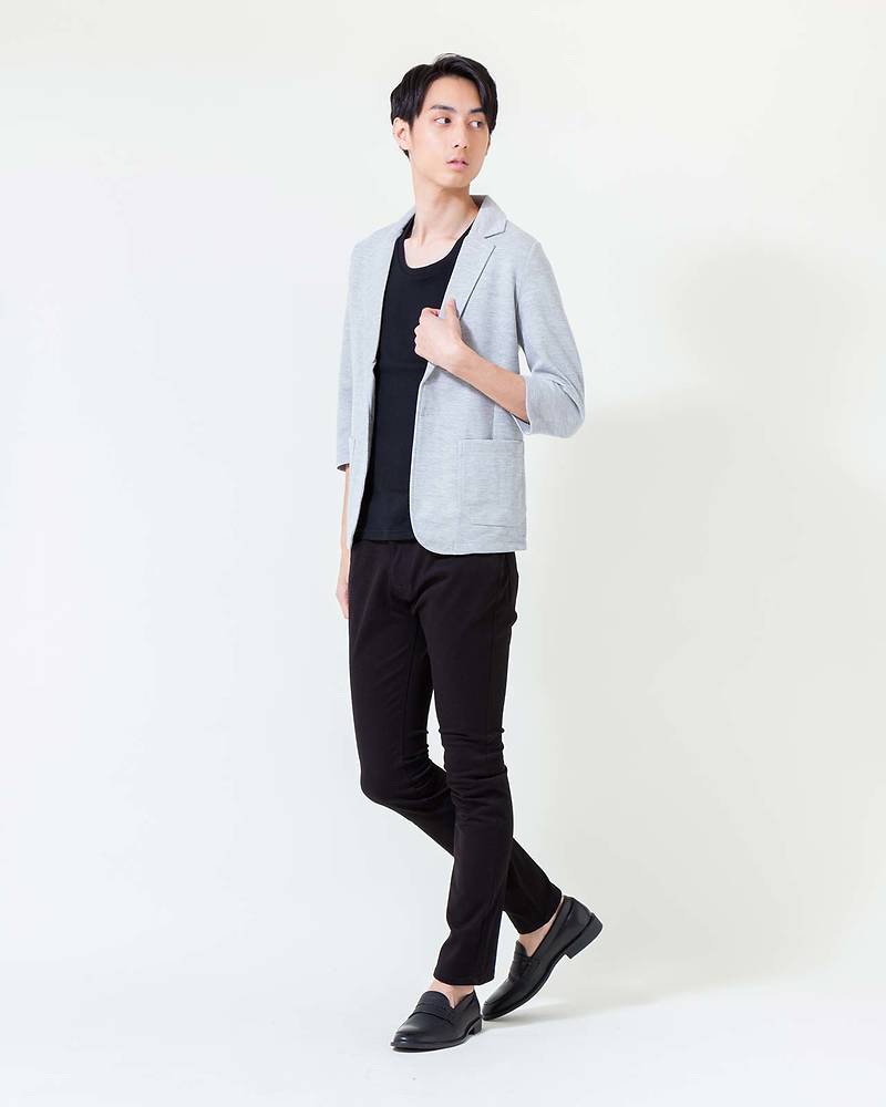 ワッフル素材のカジュアルなグレージャケットを使ったコーデ。