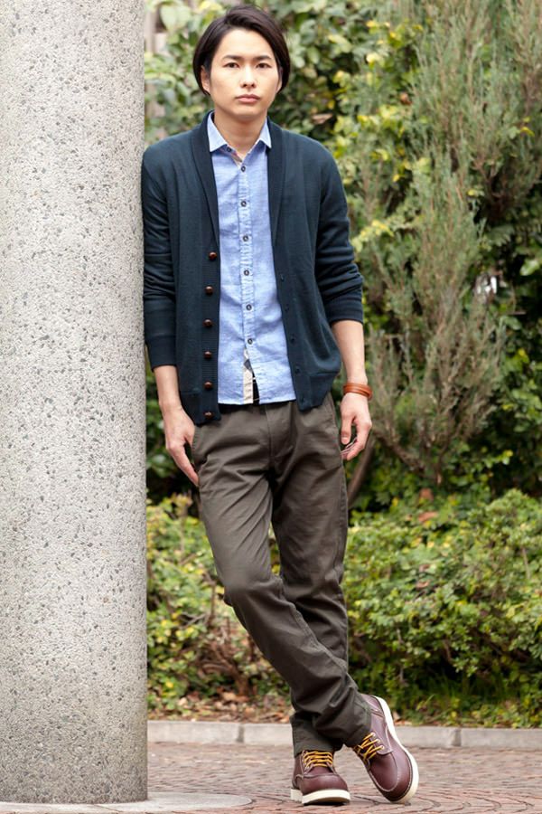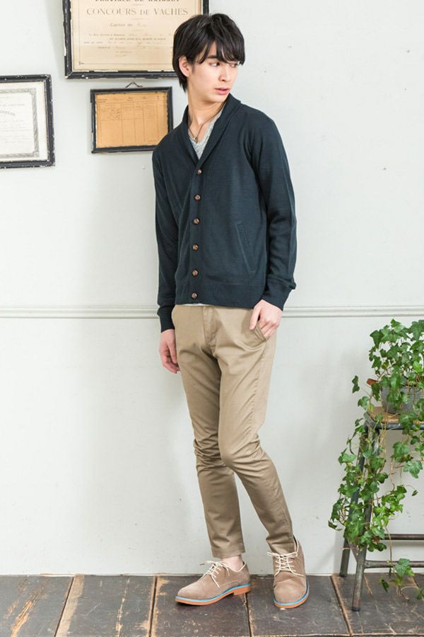 シンプルなカーディガンとチノパンを合わせると、知的男子に変身。