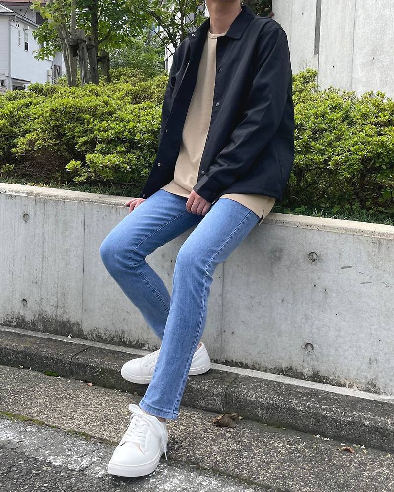 定番デニムはカジュアルな印象になりやすいですが、コーチジャケットでしっかりと全体の印象を締めていることでまとまってみます!