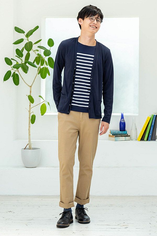 【9:ショールカーディガン×ボーダーTシャツ×ベージュチノパン】