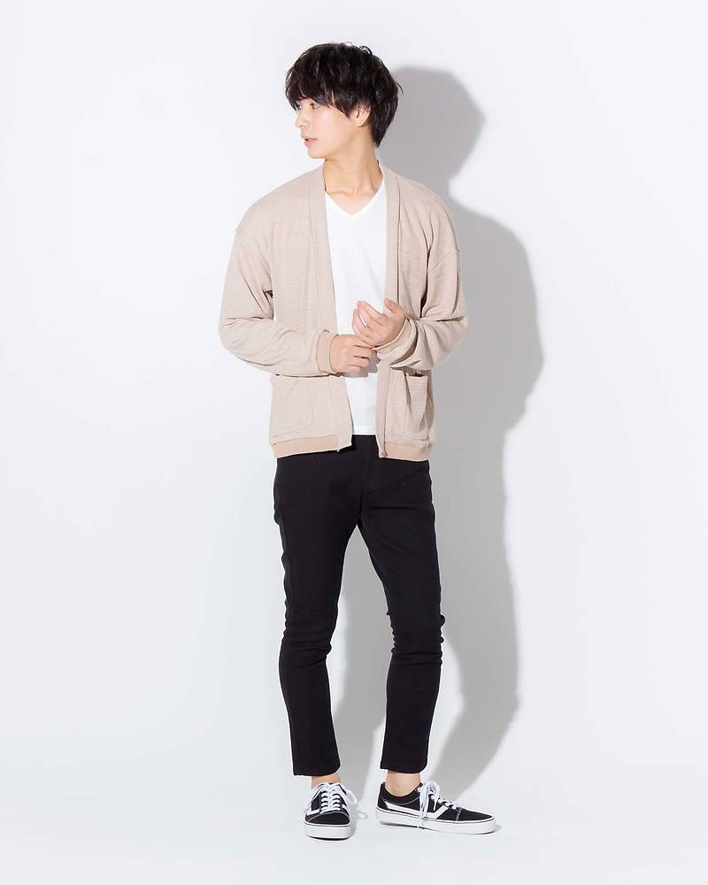 【1:カーディガン×白シャツ×黒スキニー】