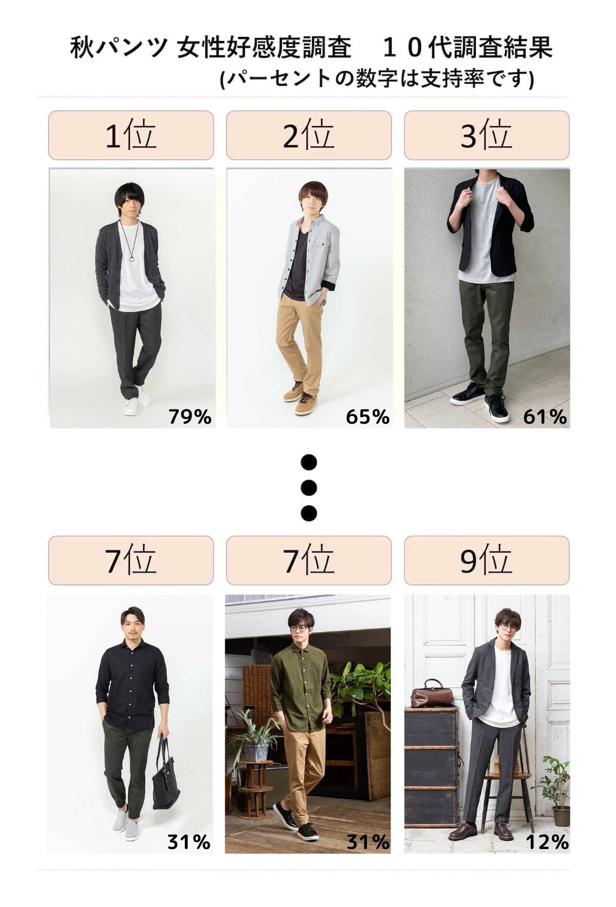 逆に伸び悩んだ7位~9位のコーデは明るい色のパンツが集まっています。