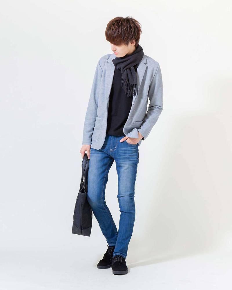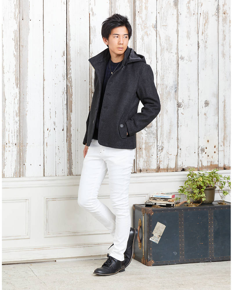 スキニーパンツや革靴でフォーマルなスタイルに寄せるとより雰囲気もアップします。