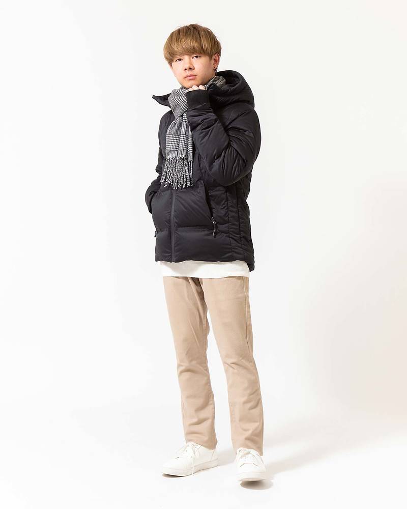 ダウンジャケットはデザインはシンプルなものが多いですが、存在感は強めなのでボトムスやシューズ選びは控えめがおすすめ!