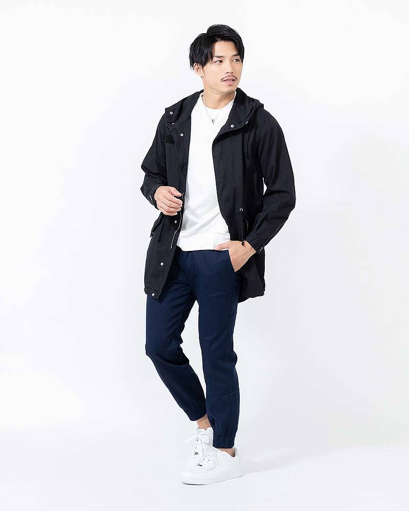 軽やかな印象を与えるモッズコートにジョガーパンツでカジュアルにまとめたコーデです!
