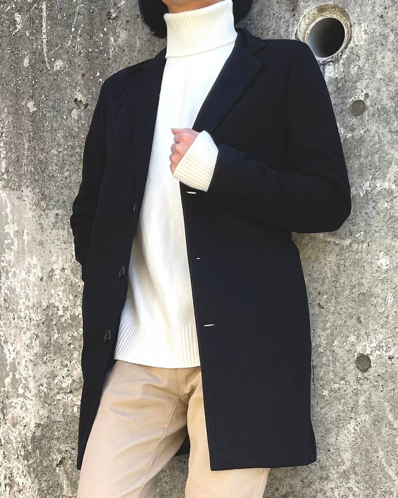 ロングウールコートにタートルネックを合わせたコーディネートです。