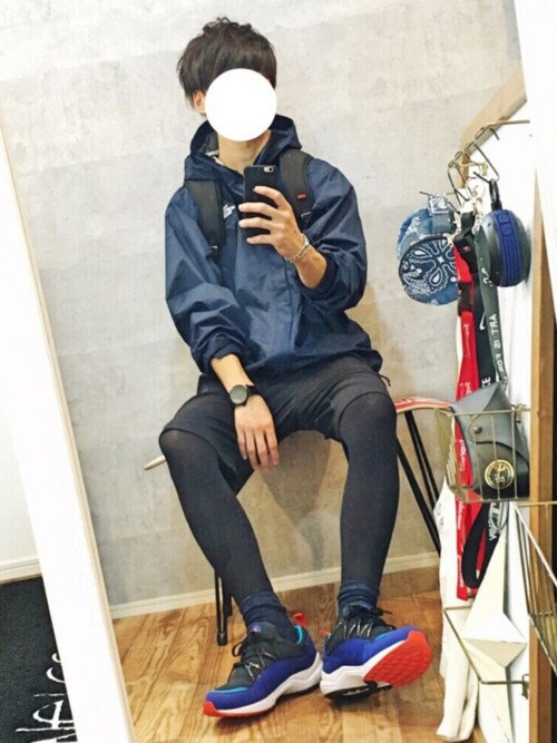 ノースフェイスの定番レインパーカーに黒いインナーとハーフパンツという組み合わせ。