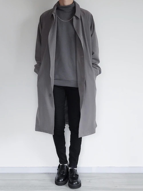オーバーサイズのステンコートを使ったモノトーンコーデです。