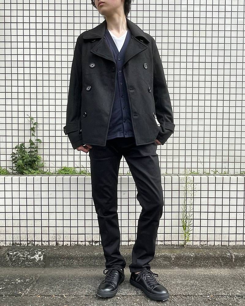 Pコートに黒チノパン、フェイクレザースニーカーを組み合わせたクールなコーディネートです。