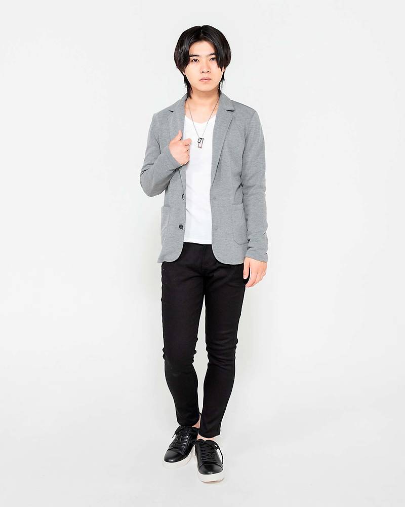 黒チノパンと白インナーを使ったモノトーンに、グレーのテーラードジャケットを羽織っただけのシンプルなコーデですが、すっきりしたキレイめコーデにまとめています。