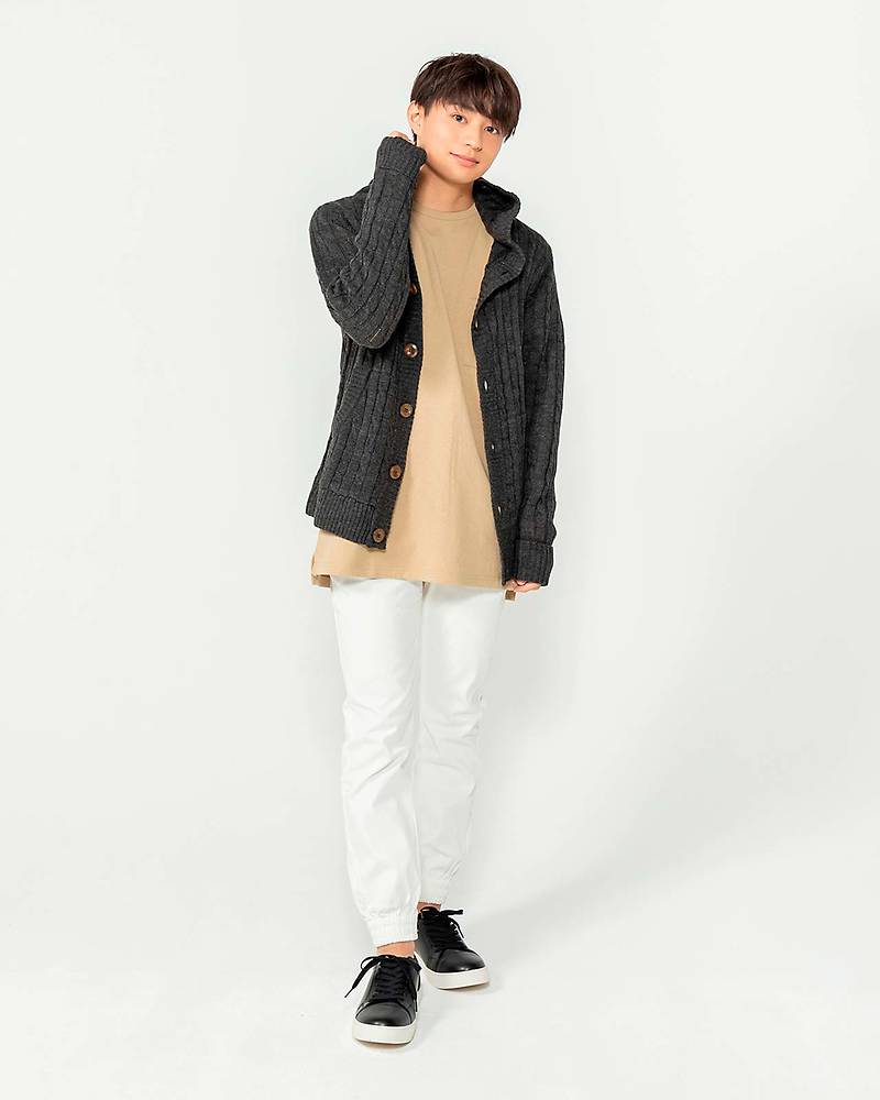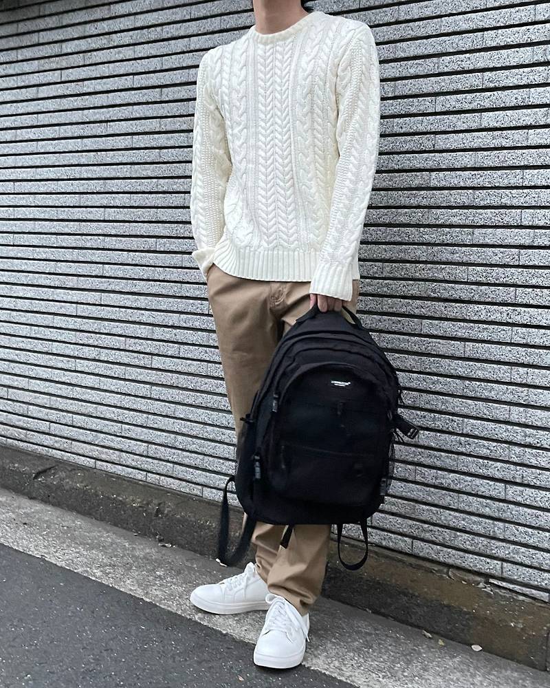 少し重めのケーブルニットに白チノパンでYラインを印象付ける