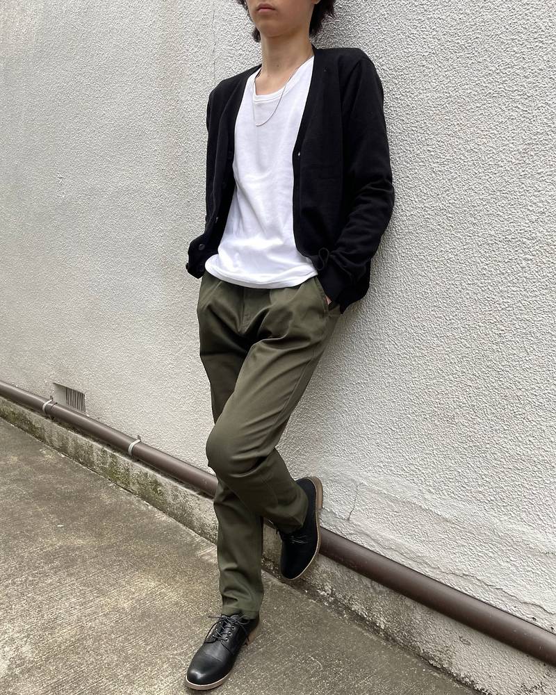 カーキ色と黒カーディガンで落ち着いた雰囲気に