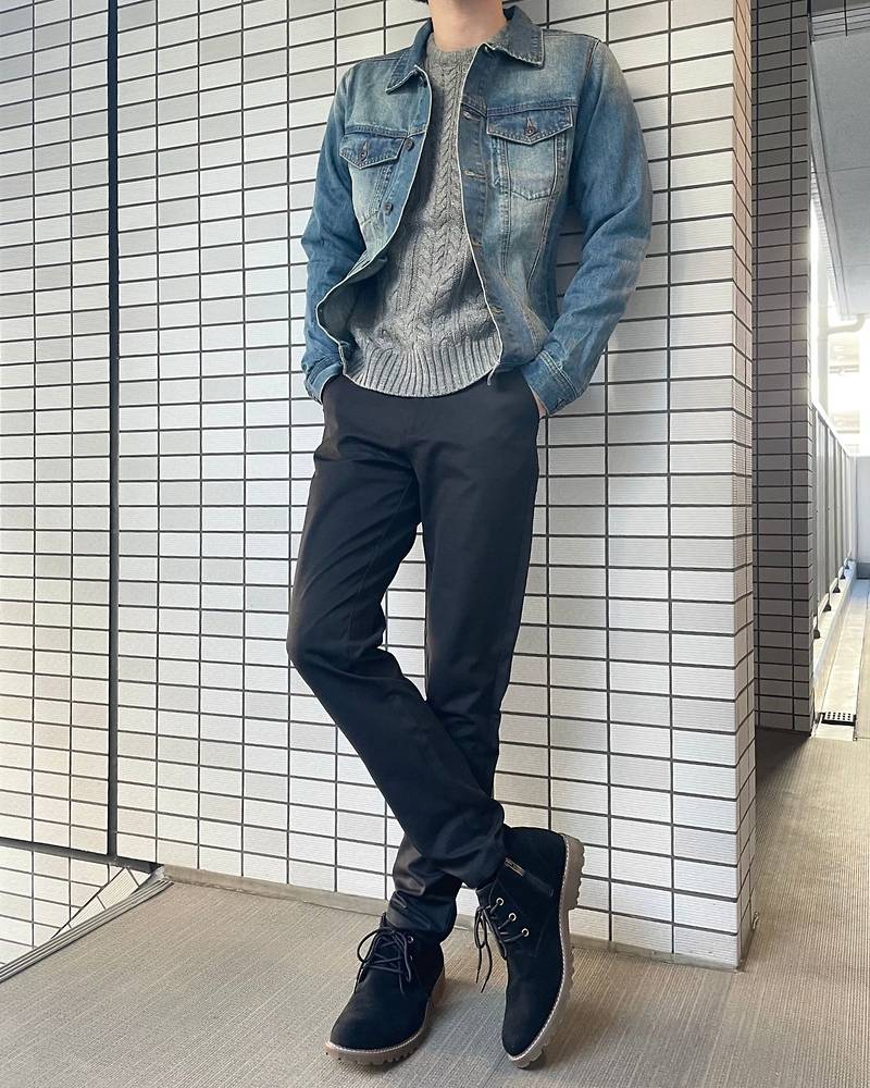 程よい色あせ具合のデニムジャケットやチャッカブーツで男らしくまとめたコーデに、グレーのケーブルニットで柔らかさをプラス。