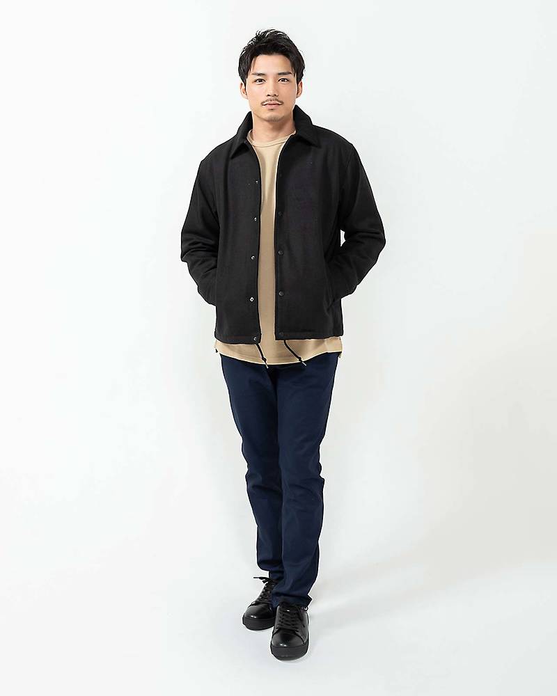 秋の定番アウターであるコーチジャケットも、黒を合わせることで落ち着いた印象に変わります。