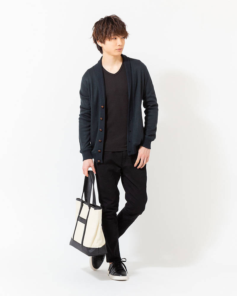 シンプルなニットカーディガンも、黒を中心に合わせることで落ち着いた大人コーデに。