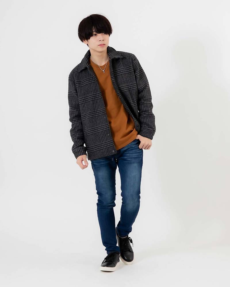 グレンチェックを使ったコーチジャケットにテラコッタカラーを組み合わせたコーデ。