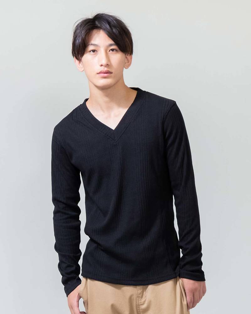 ランダムテレコVネック長袖Tシャツ(ブラック)