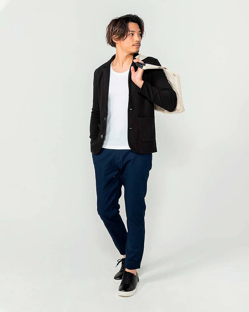 ジャケットにトレンドのジョガーパンツを組み合わせたスタイル。