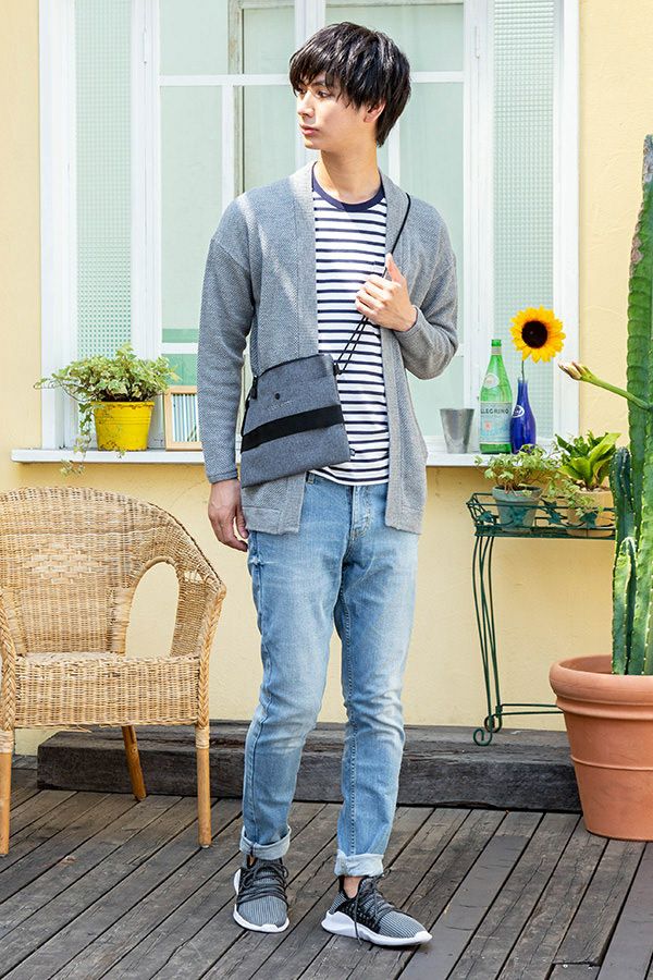 シンプルなグレーカーディガンは羽織るだけでカッコいい☆淡いサックス色のデニムで軽やかな明るい印象に◎