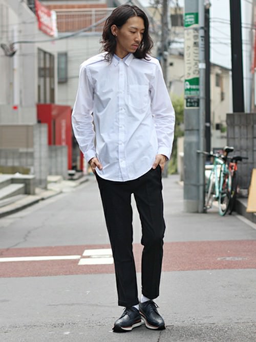 ホワイトシャツもキレイめパンツと組み合わせると、どこか洗練された印象に。