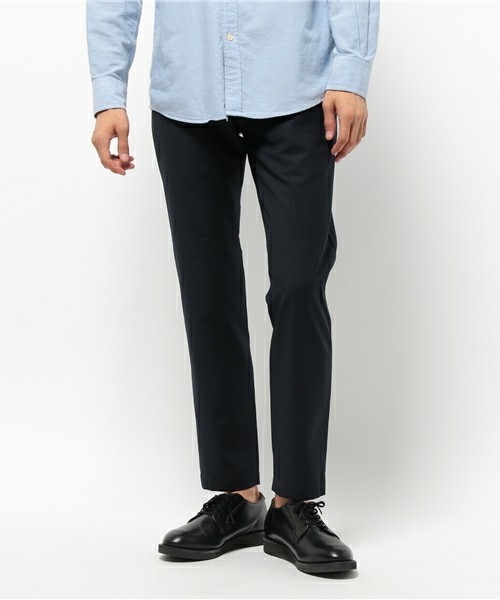 スーツのようなテロッとした素材感、ひざ下が細くなったテーパードシルエットが特徴。