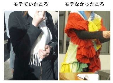 画像の左側は私がモテていた時期のファッション、右側はモテなかったころのファッションです。モテていたころは「とにかく無難な服装」をテーマに、渋谷のマルイで買いそろえた服を選んでいました。ものすごくオシャレというわけではないですが、話しかけやすい恰好だったと思います。