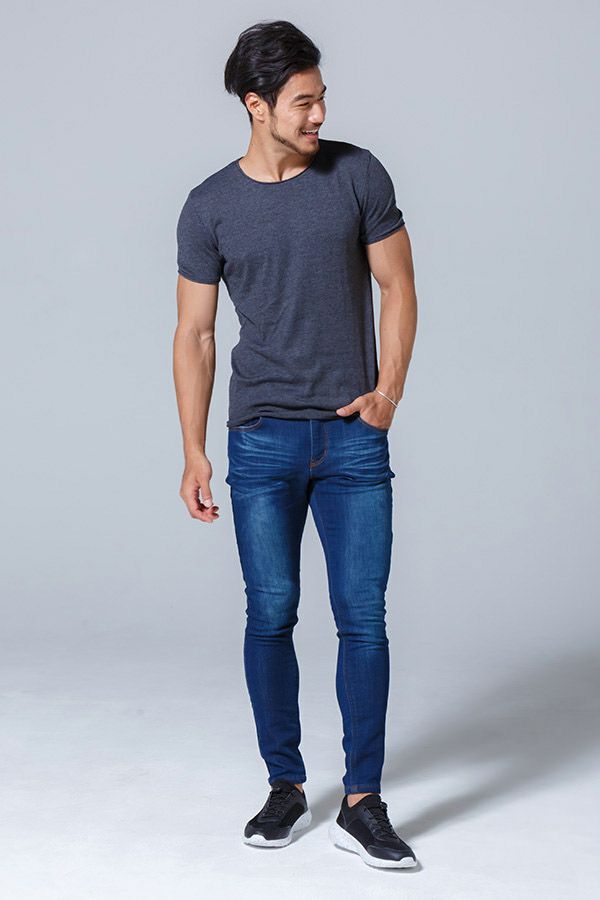ふくよかな男性でもボトムスに細めのシルエットを選べばスタイリッシュに見えるのでおすすめしたい。