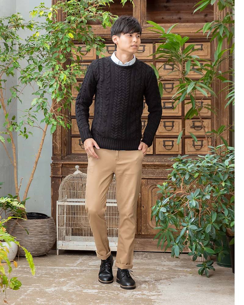 ケーブルニット×長袖シャツ×半袖Tシャツ×パンツ