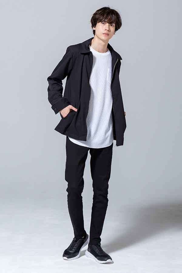 細めのパンツとシューズ、どちらの色も黒に合わせて足を長くシュッと見せています。