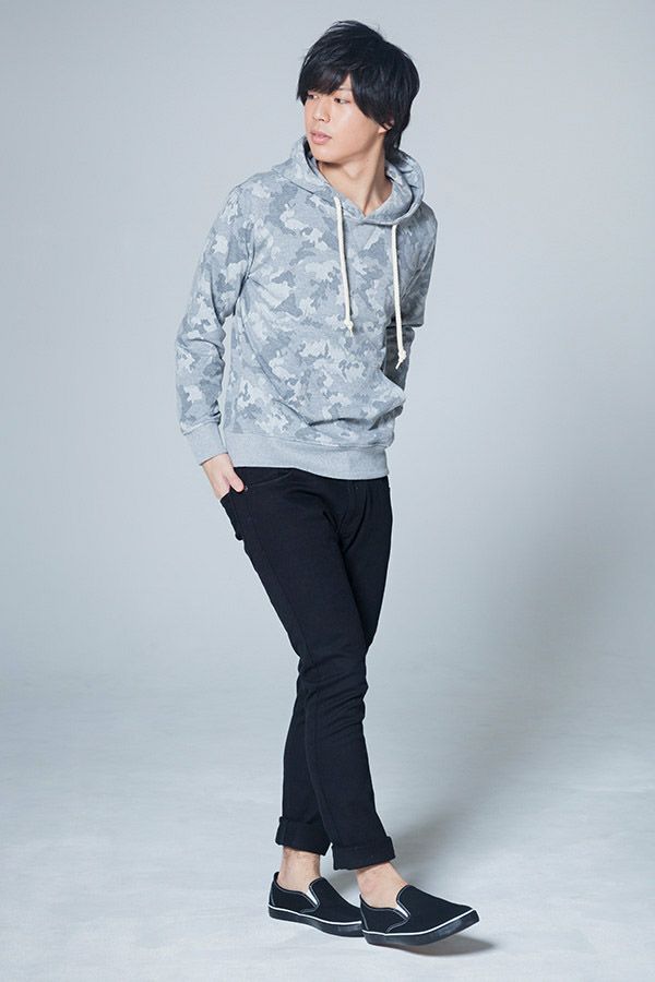 ポイントは、主張しすぎないグレーのカモフラ柄パーカー。