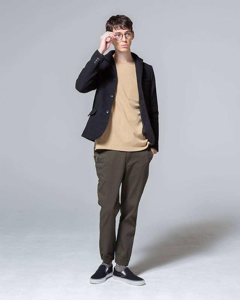 ベージュのインナーにカーキのパンツでカジュアルな雰囲気に寄っていますね。