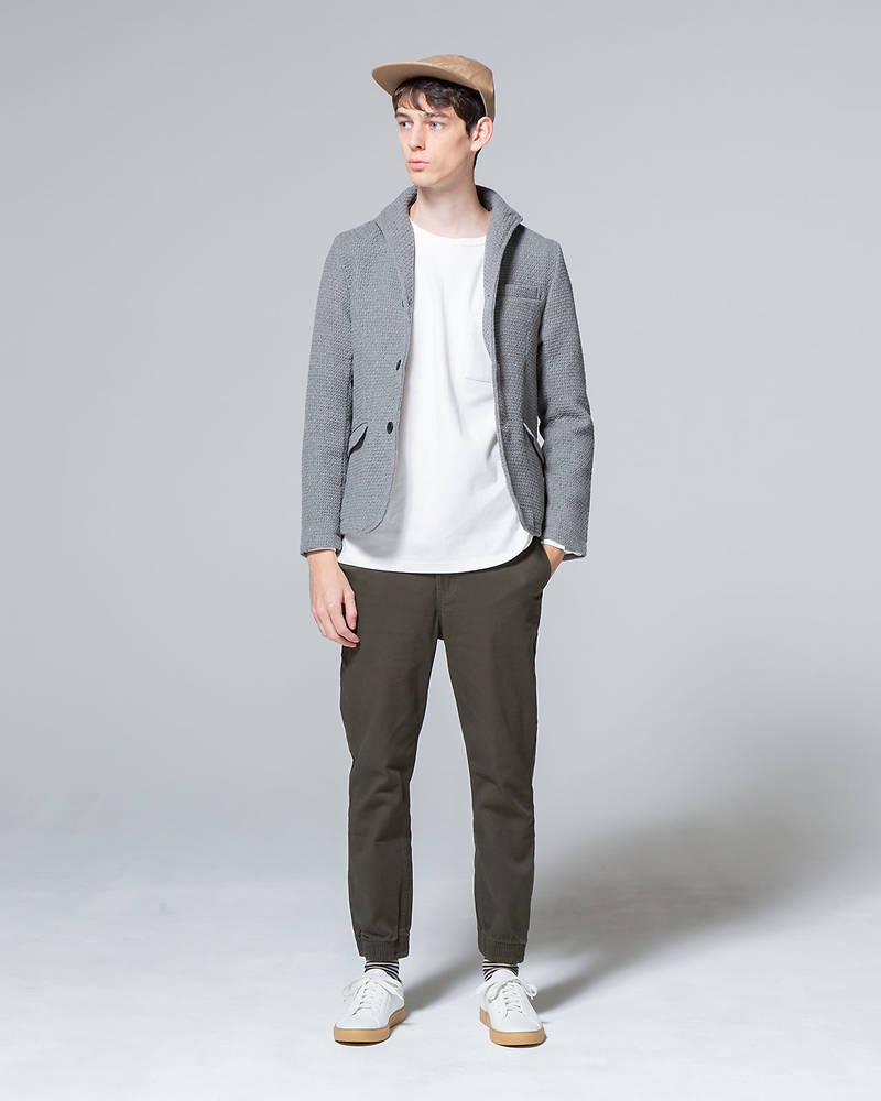 グレージャケット×白カットソーの定番コーデですが、よくある生地のジャケットのコーデよりも柔らかく優しい感じになっていますよね。