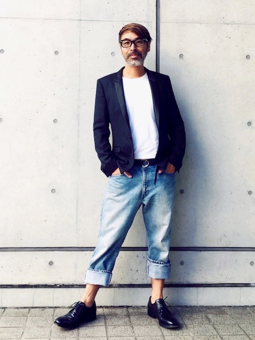 黒テーラードジャケット、白カットソー、ジーパンの定番コーデ。