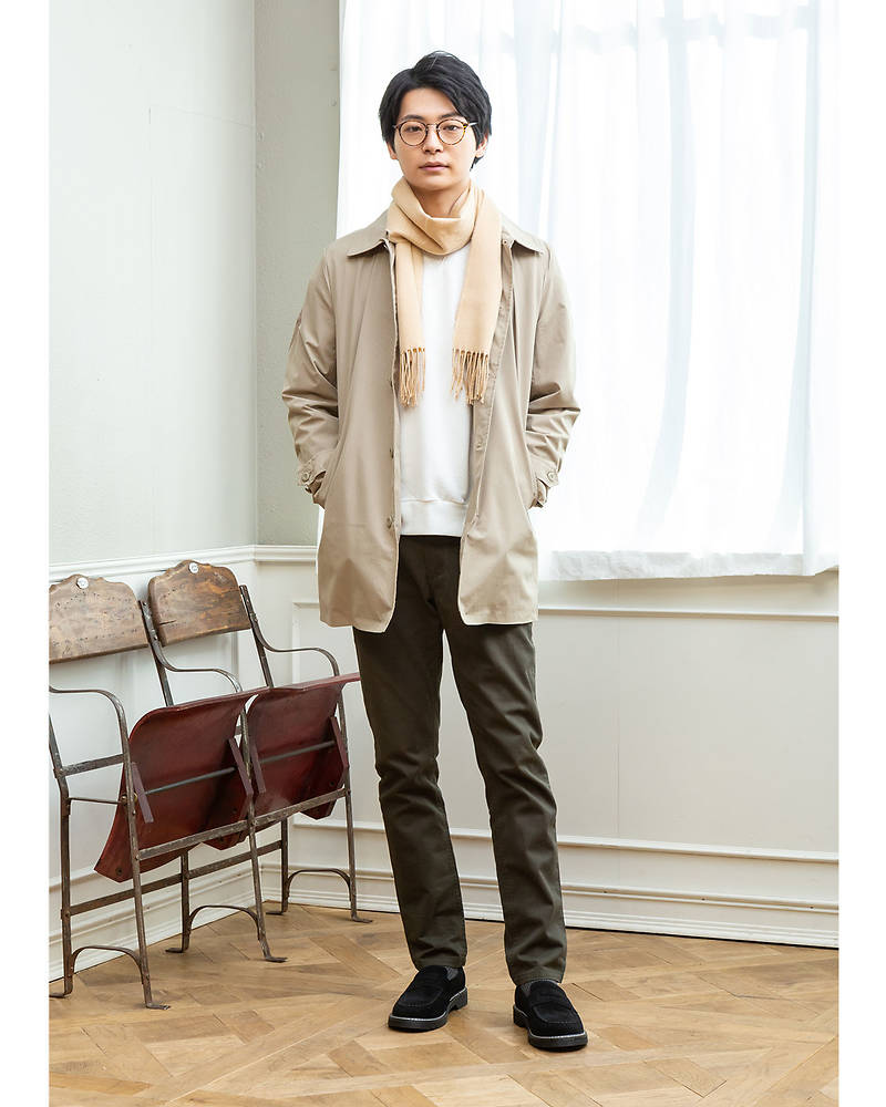柔らかい印象のカーキチノパンと明るい印象のトップスをあわせたコーデ。冬は全体的に暗くなりやすいので、上下の明暗をしっかりと分けたコーデがオシャレにみせるポイントです