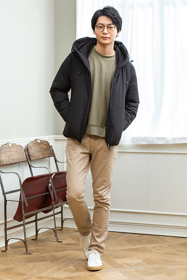 明るめの面積を増やして冬でも爽やかな着こなしになるベージュのチノパンコーデ!全部明るいと季節感を感じなくなってしまいますが、ダウンのコートを暗めにすることで冬らしい着こなしになります