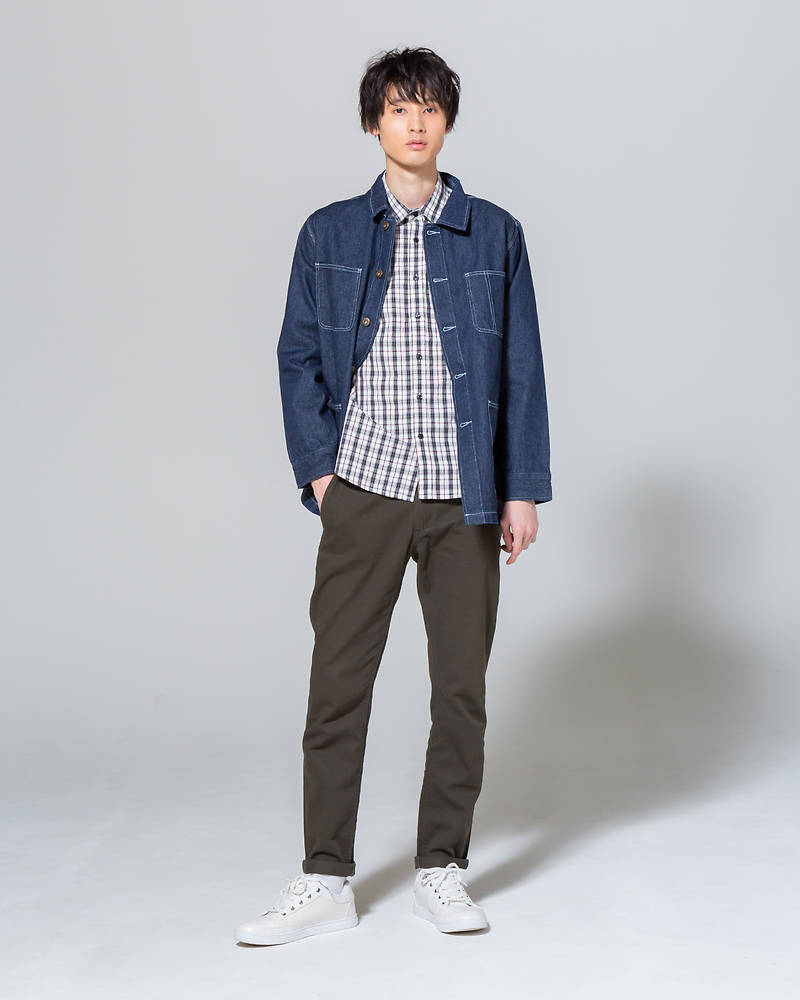 秋らしい色味のカーキチノパンに爽やかな印象なGジャンやシャツをあわせたコーデ。カーキは落ち着いた印象になりやすいので他のアイテムを爽やかにしておくとバランスが取りやすいです