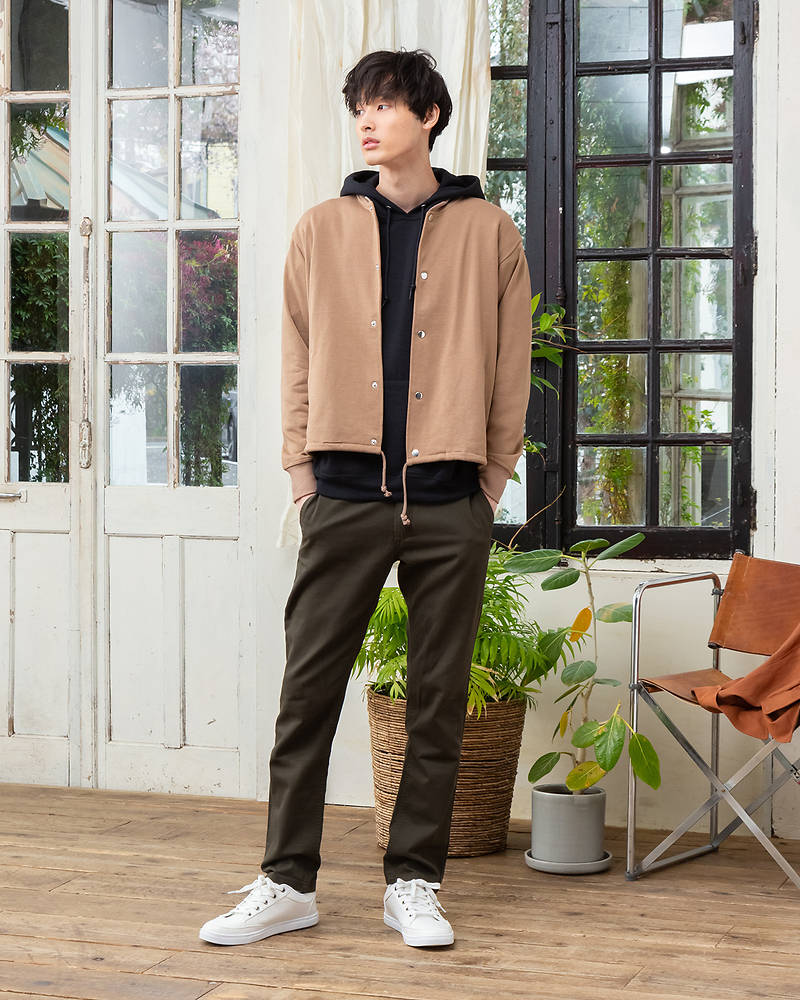 秋のカジュアルアイテムとして活躍するパーカーと合わせたコーデ。きれいなチノパンであればパーカーと合わせても上品な印象が残ります