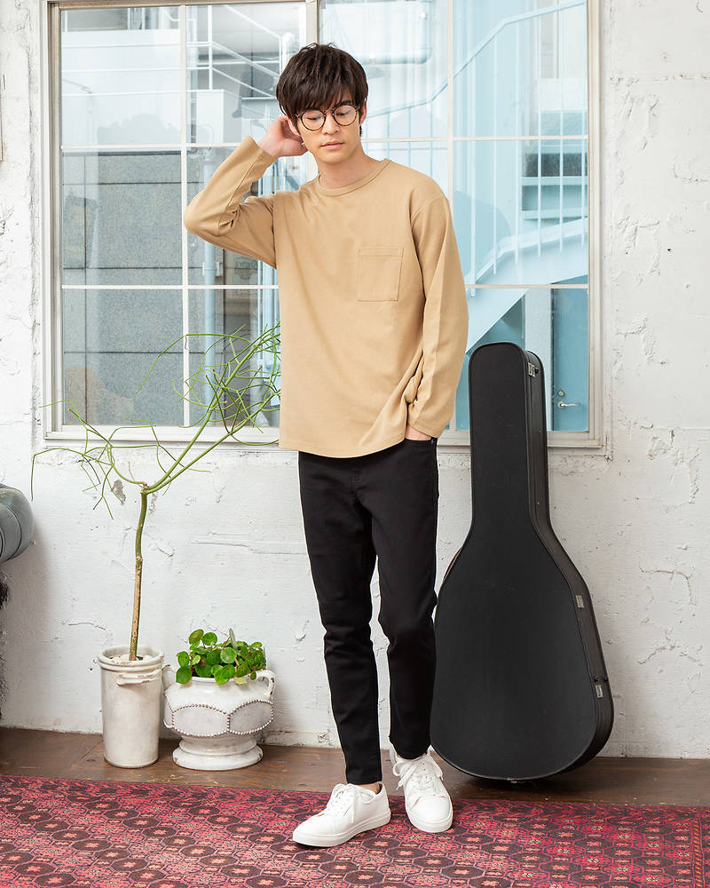 【10:ベージュ長袖Tシャツシャツ×黒チノパン】