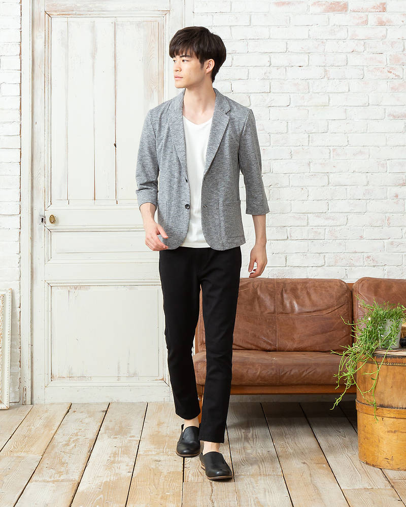 【2:グレージャケット×白Tシャツ×黒チノパン】