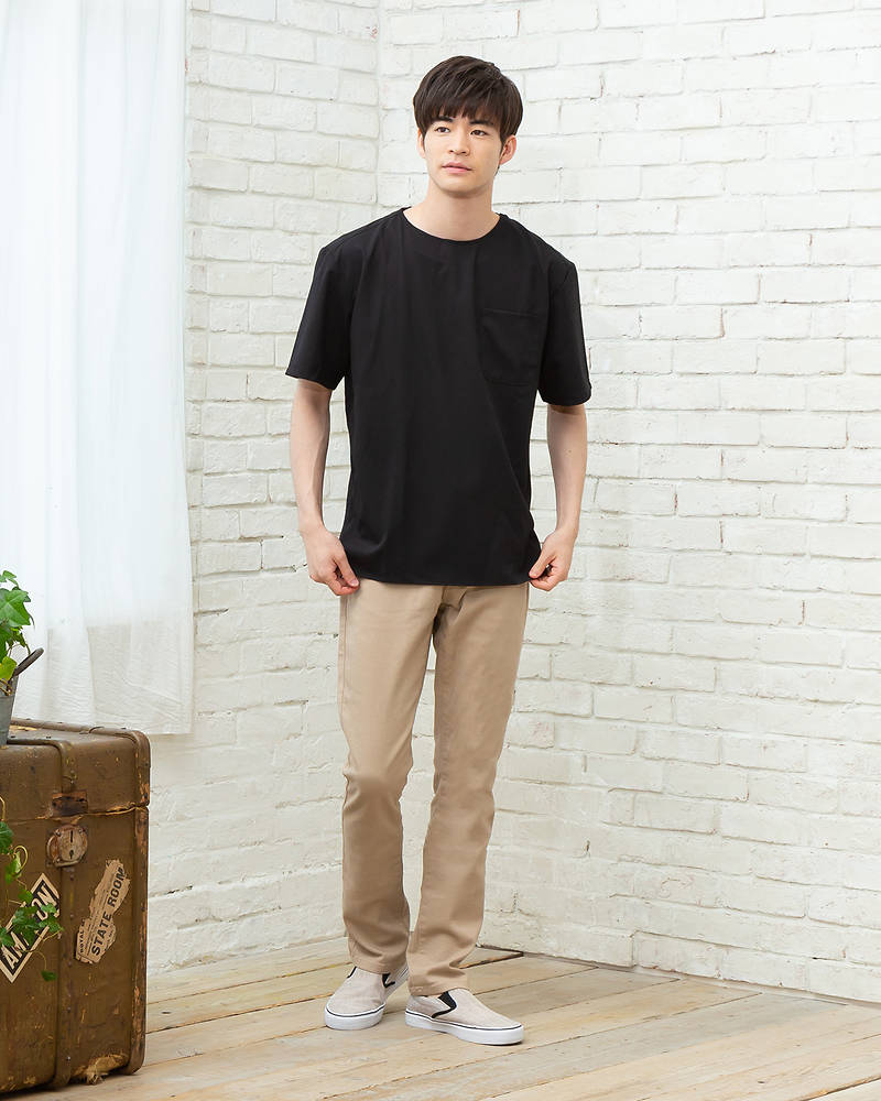 黒のチノパンに淡めのベージュのTシャツをあわせたコーデ。黒のチノパンのおかげで淡い色でも映えて見せることができる着こなし