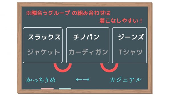 「かっちりめのスラックスとカジュアル目のジーンズとの間の印象になるアイテムなので、パンツの中で一番合わせのしやすいアイテムだからです」