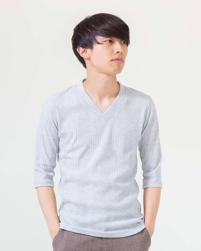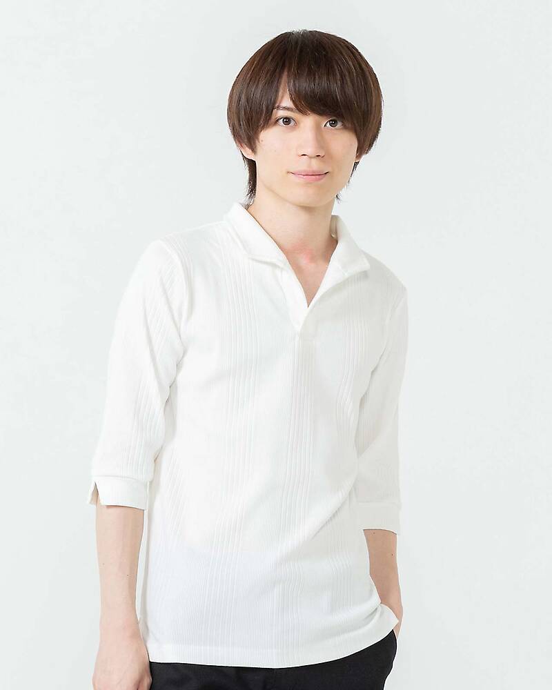 ランダムテレコ襟ワイヤー七分袖ポロシャツ(ホワイト)