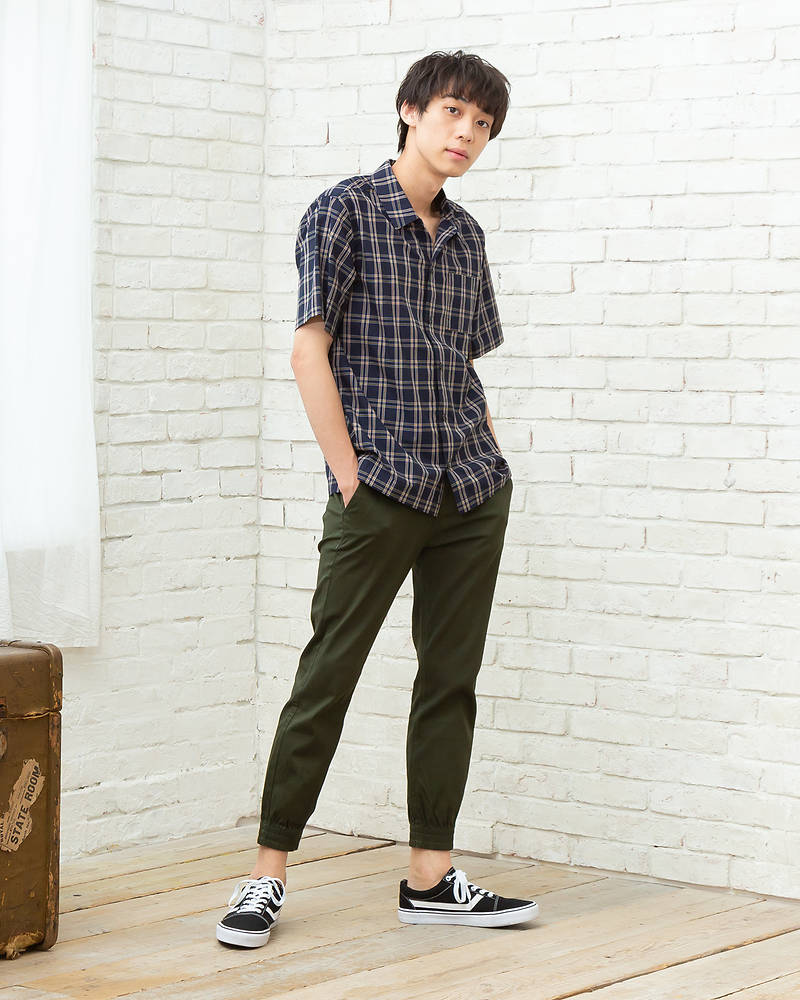 コーデが難しい半袖のチェック柄シャツもサイズをすっきりさせて、パンツの丈を短くすると夏の爽やかコーデに仕上がります!