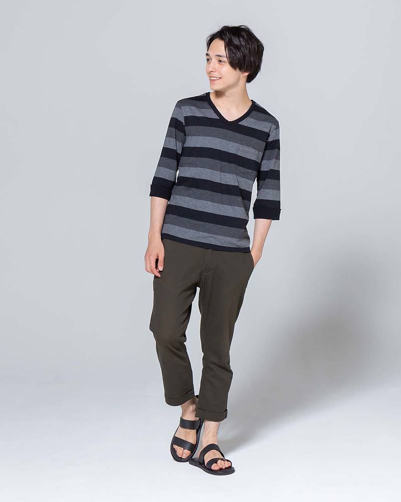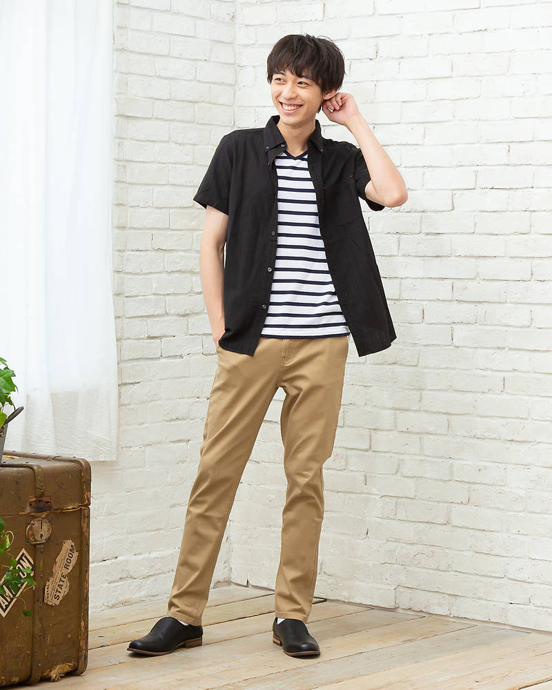 ボーダー柄Tシャツとパンツだけでは普通の青年コーデですが、黒の半袖シャツを羽織るだけで黒の色彩効果でスタイルアップに成功するだけではなく爽やか『好』青年コーデに早変わりします!