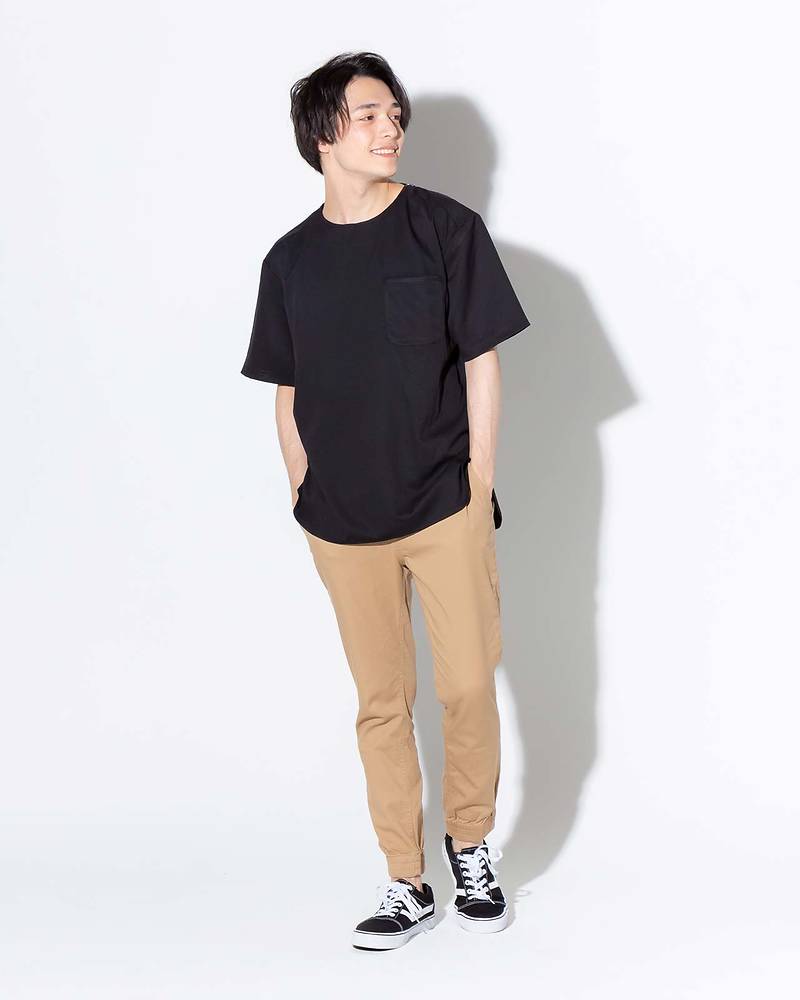 ゆったりサイズのTシャツにはシンプルな色味と細めのパンツがよく似合う。