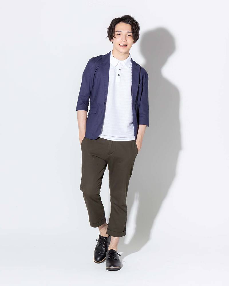 ポロシャツ×パンツだけだと、どうしてもカジュアルになりやすいですが、テーラードジャケットで清潔感とかっこよさをプラスしたバランスの良いコーデに!